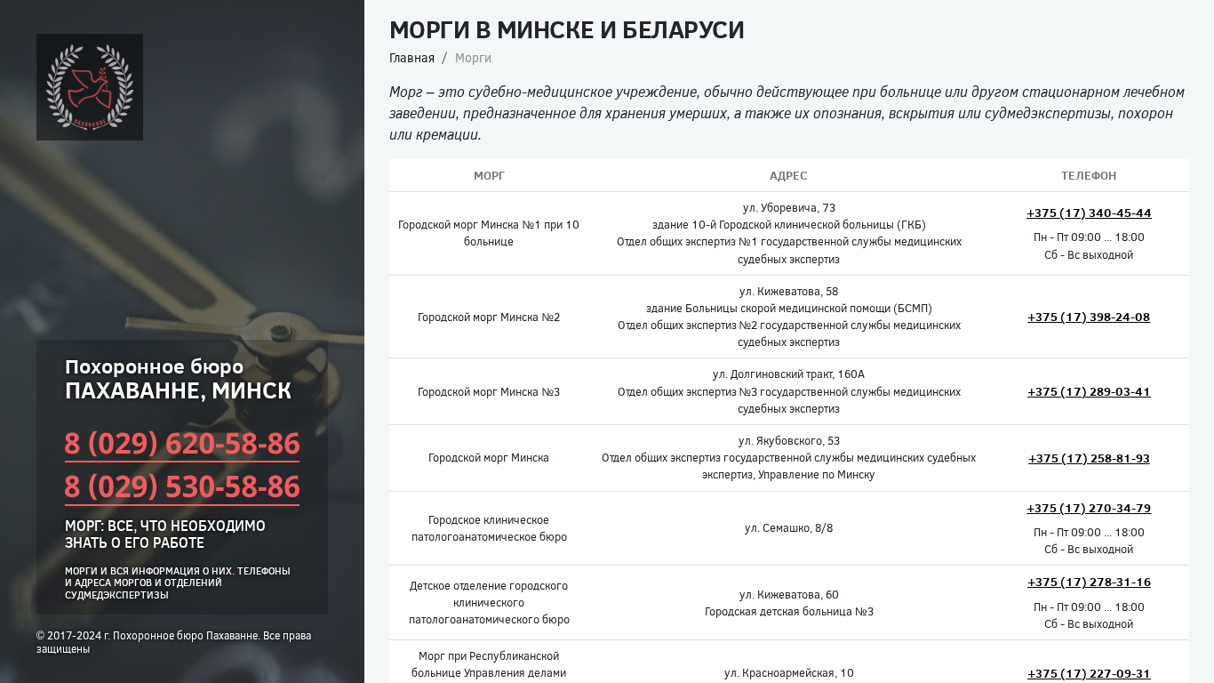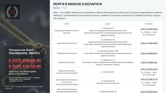Этот онлайн-ресурс предлагает обширную информацию о моргах в Минске, Беларусь, включая их адреса и номера телефонов, специально для тех, расположенных на базе больниц, таких как те, что находятся по улицам Киржеватова, Семашко, Казинца, Уборевича и других. Он также содержит детали о отделениях судмедэкспертизы (судебно-медицинских экспертиз) в этих моргах. Сайт управляется Бюро похорон "Пахаванней" и защищен авторским правом с 2017 по 2024 год. Морговая установа — это судебно-медицинское учреждение, обычно связанное с больницей или другим медицинским учреждением, отвечает за хранение, идентификацию, вскрытие и судебно-медицинскую экспертизу умерших лиц, а также их захоронку или кремацию. Сайт содержит список адресов и контактную информацию для различных моргов и отделений судмедэкспертизы.