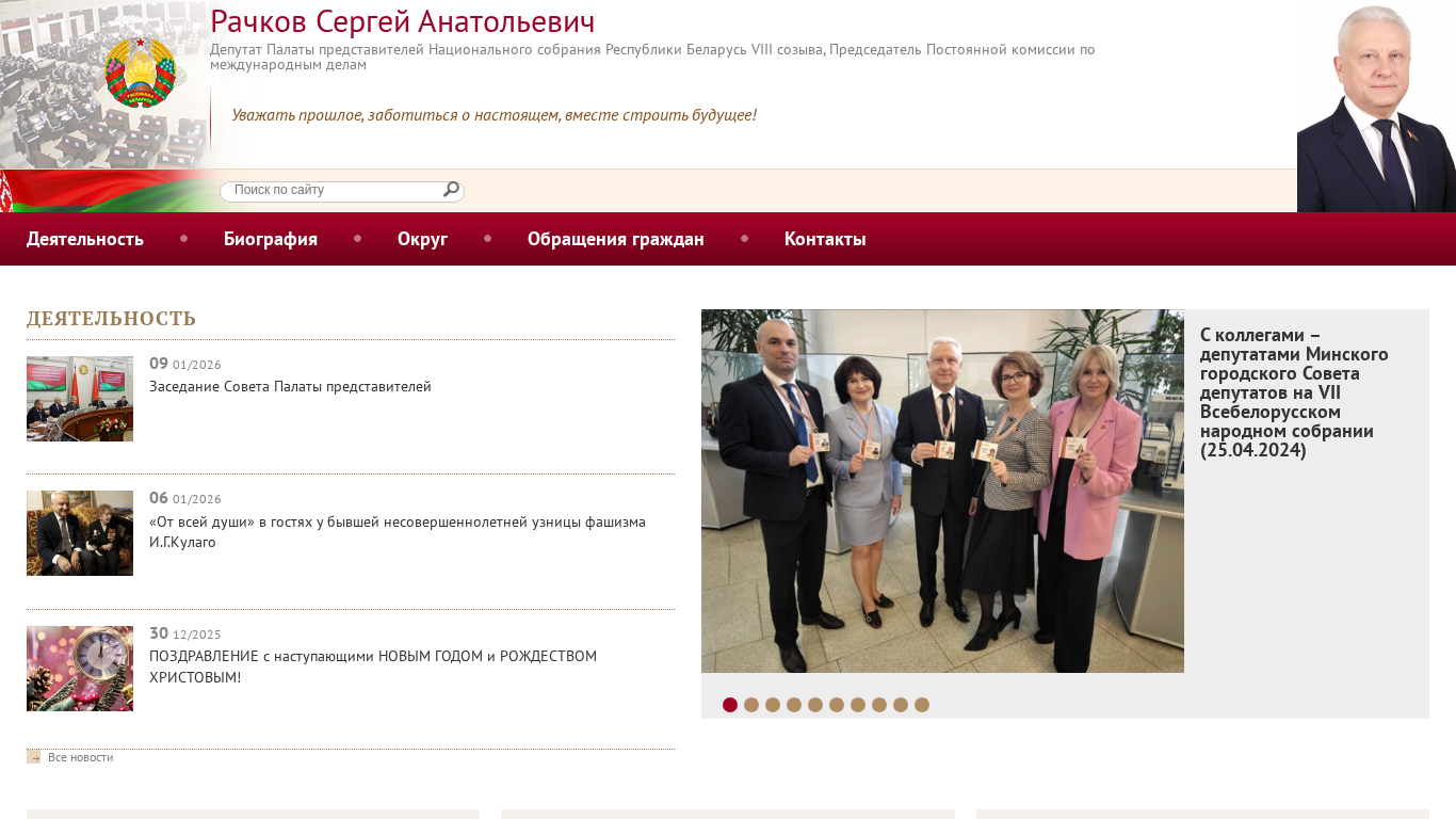 | AI-анализ | Сайт является официальным сайтом депутата Рачкова, члена восьмой сессии Национального собрания Республики Беларусь. Сайт включает информацию о его законодательной, международной и общественной деятельности. Ключевые слова, ассоциируемые со страницей, включают "Беларусь", "республика", "представители", "собрание", "дейность", "электронная почта" и контактные данные. Меню сайта содержит разделы по законодательной деятельности, международной деятельности, работе в избирательном округе, общественно-политической деятельности и другим видам деятельности. Сайт также включает биографию, раздел для обращений граждан и контактов, а также информацию о его помощниках и коллегах. Сайт предоставляет детали о различных событиях, включая встречи с бывшими политическими заключенными и участие в VII Всебеларусском народном собрании и VII Всебеларусском конгрессе парламентариев. Сайт также содержит информацию о первой сессии восьмой сессии Дома представителей. |