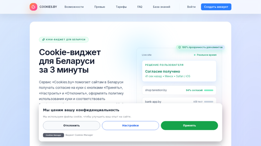 Сайт Cookies.by представляет собой решение для управления куки для белорусских компаний, предназначенное для соответствия Закону 99-З о персональных данных путем настройки баннера с уведомлением о куках и аудита, включая режим согласия Google, а также поддержку юристов без потери аналитики. Ключевые слова включают в себя 'cookie-widget Беларусь', 'баннер согласия для куек Беларусь', 'Закон 99-З', 'сканирование куек' и 'режим согласия Google'. Сайт предлагает демонстрацию, ценообразование, раздел с часто задаваемыми вопросами, базу знаний, функции входа и регистрации, а также включает в себя менеджер для управления куки за три минуты. Он помогает белорусским сайтам получить согласие на использование куек с кнопками 'Принять', 'Настроить' и 'Отказать', формирует политику использования куек и соответствует требованиям Закона 99-З, сохраняя при этом аналитику с помощью режима согласия Google. Также предоставляется политика использования куек.