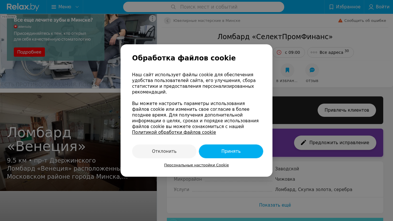 | SEO-описание | Ломбард СелектПромФинанс в Минске – отзывы, телефоны, график работы и карта проезда на Relax.by |