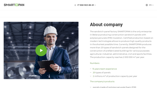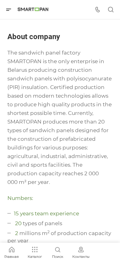 | AI-анализ | Этот сайт предназначен для белорусской компании по производству панелей-сэндвичей под названием Smartopan. Сайт предоставляет информацию о компании, её местоположении и контактных данных. Название сайта — "Smartopan", а в описании содержатся ключевые слова, связанные с панелями-сэндвичами, теплоизоляцией, производством и Беларусью. Сайт также включает фразы, такие как "Запрос на звонок" и "Email info@smartopan.com", для пользователей, желающих связаться с компанией. Компания Smartopan является единственным предприятием в Беларуси, производящим строительные панели-сэндвичи с полиизоциануратом (PIR) теплоизоляцией. Производственная мощность достигает 2 миллиона м² в год, и компания выпускает более 20 типов панелей-сэндвичей для различных целей, включая сельскохозяйственные, промышленные, административные, гражданские и спортивные объекты. Сайт доступен на обоих языках — русском и английском. |