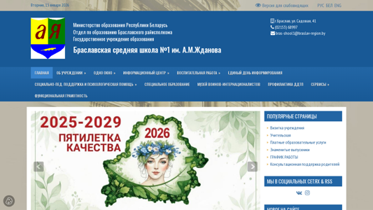 | AI-анализ | Этот онлайн-ресурс является официальным сайтом Браславской средней школы №1 имени А.М.Жданова, государственного образовательного учреждения, расположенного в городе Браслав, Беларусь, по адресу Садовая улица, 41. Сайт предоставляет информацию о школе, включая ее структуру, управление, расписание и различные услуги, такие как библиотека, ПКПП, ресурсный центр и столовая. На сайте также представлена информация о истории школы, символах и руководстве. Сайт предлагает различные административные процедуры, включая информацию о приеме, лицензировании и правилах для родителей и учащихся. Сайт содержит контактную информацию, включая электронный адрес bras-shool1@braslav-region.by. Сайт управляется Браславским районным исполкомом отделом образования под юрисдикцией Министерства образования Республики Беларусь. На сайте представлены... |