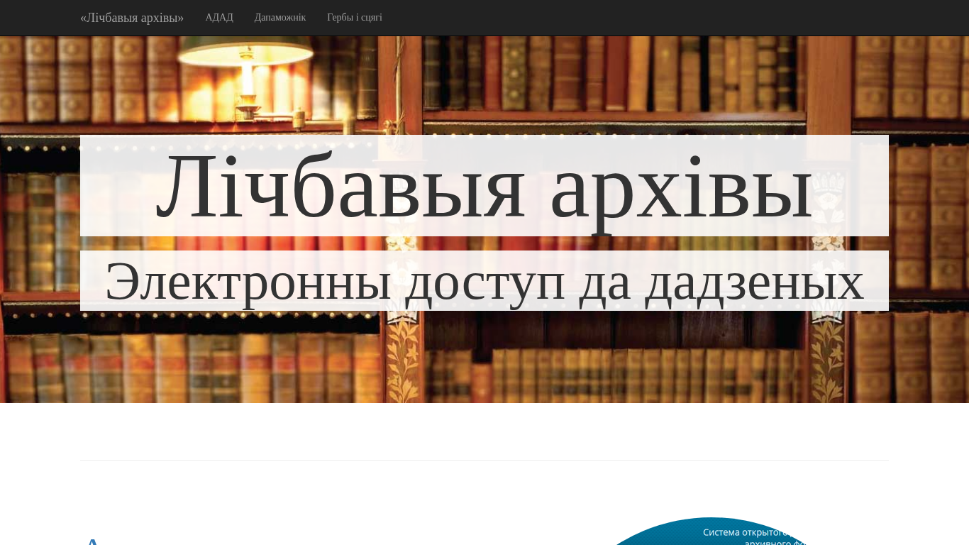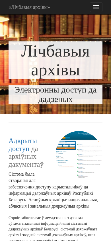 Этот онлайн-ресурс, названный "Лічбавыя архівы" (Архивы Беларуси), представляет собой цифровую платформу, созданную для обеспечения доступа к информации из национальных, региональных и государственных архивов Республики Беларусь. Система соединяет два автоматизированных информационных системы государственных архивов в Беларуси: Государственный Архив и Единая система государственных архивов, которая используется для обработки и интеграции статистической и медицинской информации из государственных архивов Республики Беларусь. Проект работал с 2014 по 2016 год и направлен на помощь пользователям в эффективном поиске информации в белорусских архивах. Пользователи могут искать информацию, основываясь на местоположениях, таких как города и деревни, и находить связанные документы и записи из различных источников архивов. Проект был завершен в 2016 году и также включает каталог современных геральдических символов Беларуси.
