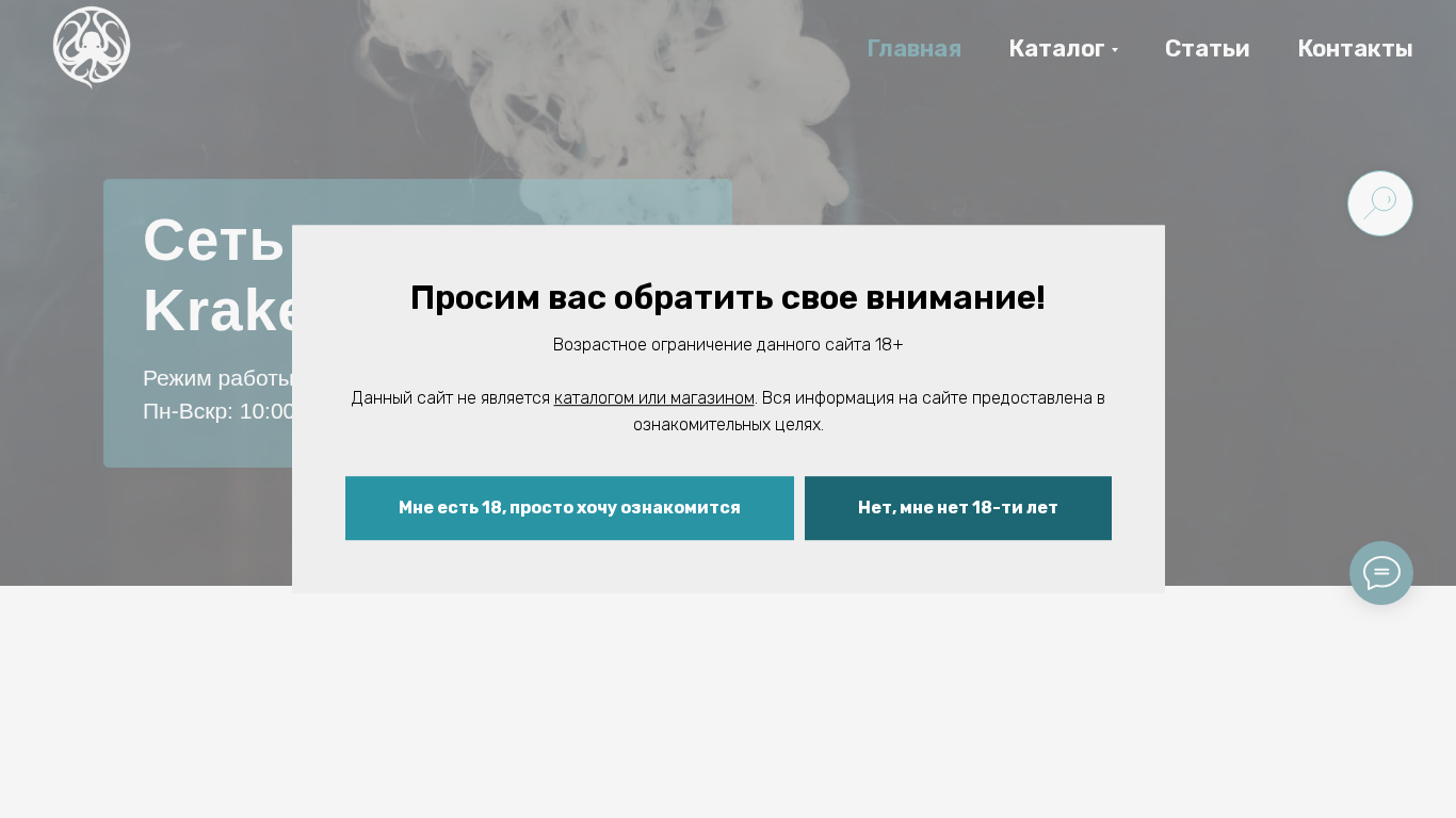 Сайт Kraken Shop является онлайн-ритейлером, специализирующимся на продаже различных товаров для вапинга, включая системные устройства, однократные электронные сигареты (однооборотные), жидкости для вапинга, компоненты для системных устройств, кальяны и сопутствующие аксессуары. Магазин предлагает доставку за один день и регулярные акции и скидки. Основными категориями продукции являются системы для вапинга, однократные электронные сигареты, жидкости для вапинга, компоненты для системных устройств, кальяны, а также аксессуары к кальянам, включая табак для кальяна и товары. Магазин работает с понедельника по воскресенье, с 10:00 до 22:00. На сайте размещается уведомление, что сайт не является каталогом или магазином, а скорее информационным ресурсом, и что продажа электронных сигарет возможна только в розничной продаже.