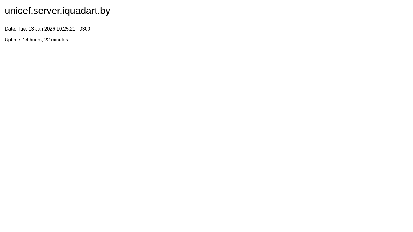 | AI-анализ | This website belongs to the UNICEF organization and is located at the domain unicef.server.iquadart.by. The title of the homepage is not provided, but based on the domain name, it is likely to be related to UNICEF. The description field is empty. The keywords associated with this website include "unicef," "server," and "iquadart." The top words, which represent the most frequently occurring words in the website's metadata, also include "date," "tue," "jan," "2026," "0300," "uptime," "hours," and "minutes." The website's current uptime is 14 hours, 22 minutes. |
