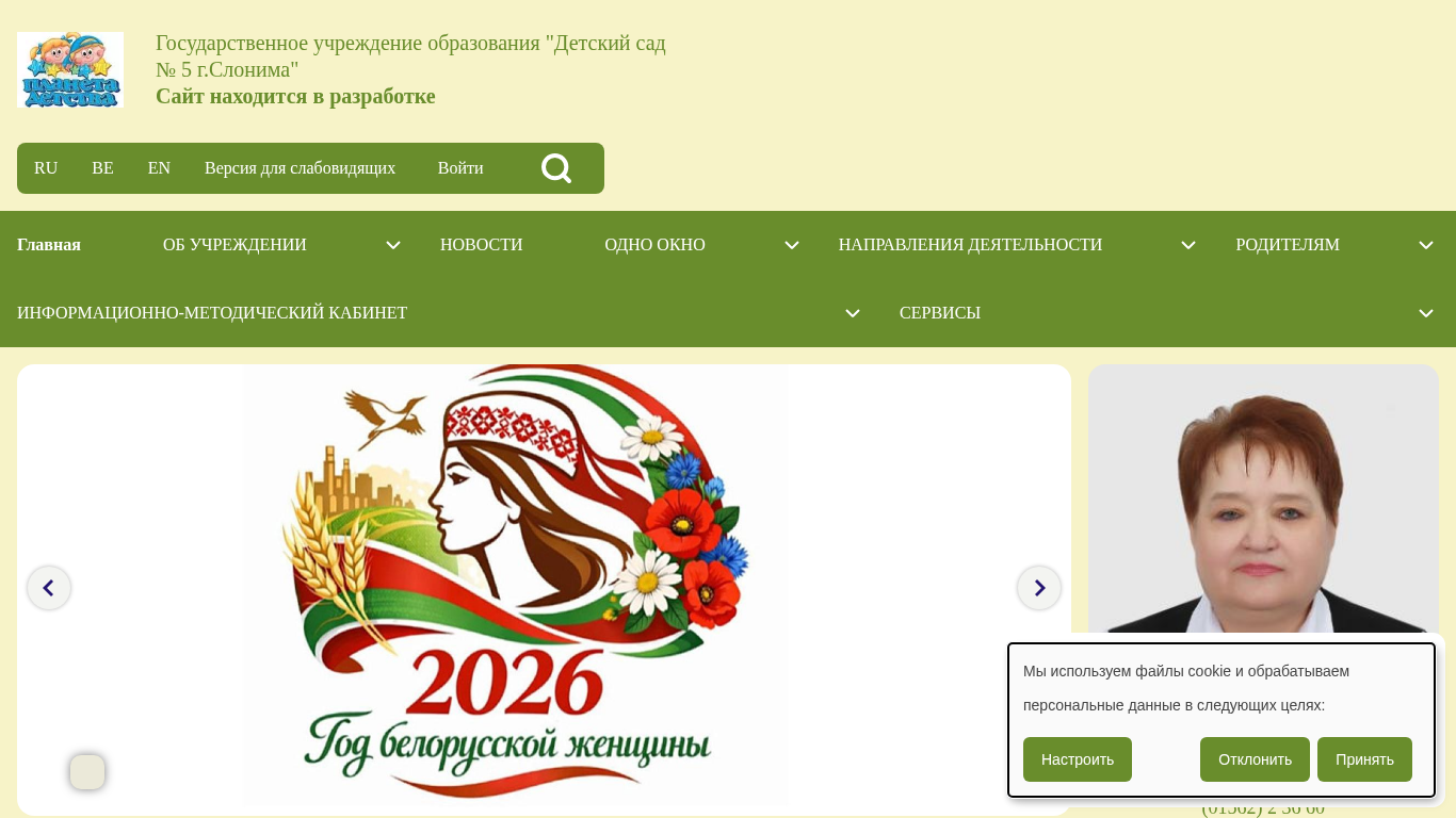 | AI-анализ | The web project "Главная | Государственное уchrejdenie obrazovaniia "Detskii sad № 5 g.Slonim" (Homepage of State Educational Institution "Childcare Facility № 5 in Slonim") is under development. The main menu includes sections on "About the Institution," "Licensing and Objectives," "Regulations and History," "Contact Information," "Material Base," "Events and Achievements," "Policies on Personal Data Protection," "Counter Corruption Measures," "Primary Trade Union Organization," "Parent Council," "Vacancies," "News," "One Window," "Legal Normative Acts," "Higher Organizations," "Personal Reception," "Electronic Reception," "Administrative Procedures," "Hotline," "Guidance for Parents," "Ped |
