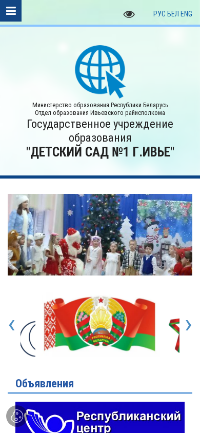 Этот сайт предназначен для государственного образовательного учреждения под названием "Детский сад №1 г.Ивье" (Дошкольное учебное заведение №1 в Ивье), расположенного в Ивье, Беларусь. Сайт предоставляет информацию о структуре, руководстве, персонале, вакансиях, истории и достижениях учреждения. Также на сайте представлены разделы по вопросам безопасности, лицензированию и контактам. Основные разделы сайта включают "О нас", "Новости", "Лицензия" и "Контакты". Сайт управляется Ивьским районным отделом образования под юрисдикцией Министерства образования Республики Беларусь. На сайте имеется раздел для людей с ограниченными возможностями и предлагается услуга "Одно окно" для административных процедур. Дошкольное учебное заведение предлагает различные программы обучения.