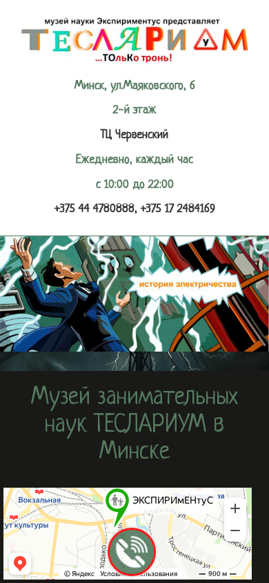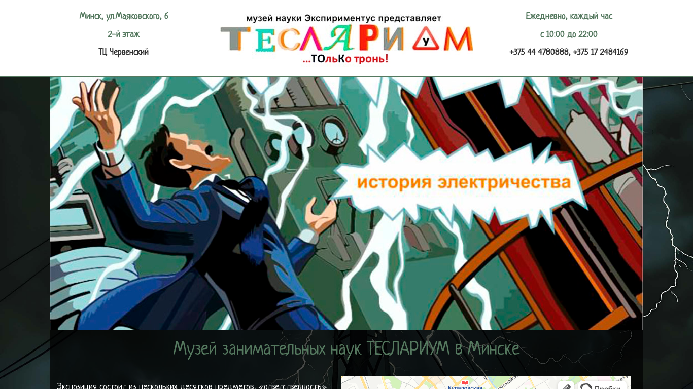 Сайт Teslarium.expirimentus.by представляет собой музей в Минске, Беларусь, расположенный по адресу ул.Маяковского 6, 2 этаж в торговом центре Червенский. Музей под названием Teslarium открыт ежедневно с 10:00 до 22:00 и может быть контактирован по телефонам +375 44 4780888 или +375 17 2484169. В музее представлено несколько десятков объектов, связанных с Николой Теслой и электричеством, включая Тесловые катушки, рентгеновские лучи, электровыжг, трубку Томсона, генератор электричества, миниатюрный ускоритель частиц, генератор Ван дер Граафа, лестницу Джейкоба и магнитную подвеску. Посетители могут взаимодействовать с некоторыми экспонатами, включая производство электроэнергии.