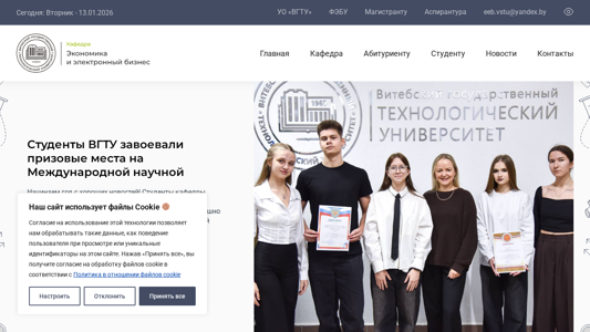 | AI-анализ | Портал eeb.vstu.by является веб-сайтом, принадлежащим к кафедре "Экономика и Электронный Бизнес" Витебского Государственного Технического Университета в Беларуси. Сайт использует файлы cookie и требует согласия пользователя на их обработку в соответствии с политикой использования файлов cookie. Основные функции сайта не могут работать без "необходимых" файлов cookie. Аналитические файлы используются для понимания взаимодействия пользователя с сайтом, предоставляя данные по метрикам, таким как количество посетителей и источники трафика. На сайте отсутствуют внешние файлы cookie социальных сетей или отзывов. На сайте представлены баннер Витебского Государственного Технического Университета (ВГТПУ), контактная информация для заинтересованных абитуриентов, а также разделы новостей. |
