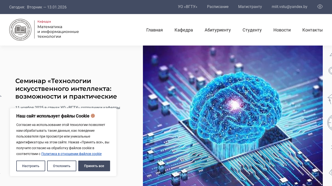 Проект веб-сайта "Математика и информационные технологии" (MIIT) на miit.vstu.by представляет собой объединенный отдел "Информатики", "Инженерной графики", и "Прикладной и теоретической математики" Витебского государственного технического университета (ВГТУ) в Беларуси, созданный в 2015 году. Сайт использует куки для обеспечения функциональности и анализа. Посетители могут принять или отклонить эти куки, с необходимыми для корректной работы сайта. MIIT предлагает информацию о семинарах, новостях и контактах, также доступен магистерский программы. Домен является частью образовательного сетевого ресурса ВГТУ.