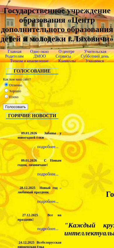 | AI-анализ | Портал является веб-сайтом государственного образовательного учреждения "Центр дополнительного образования детей и молодежи г. Лиаховичей" (ЦДОДИМ). Он предоставляет информацию о деятельности центра, включая миссионное заявление В.А. Сухомлинского, культурные предложения, выбор языка и новости от Министерства образования. На сайте анонсируется третья (региональная) стадия Республиканской олимпиады по школьным предметам, проходящая в различных образовательных учреждениях с 12 января по 16, и III Молодежный научный форум с 20 по 22 января, оба в Минске. Кроме того, на сайте упоминается определение мест проведения экзаменов для централизованного экзамена 2026 года и публикация видеорешений третьего дистанционного обучения Молодежного движения олимпиады. Портал доступен на белорусском языке и предлагает различные услуги. |