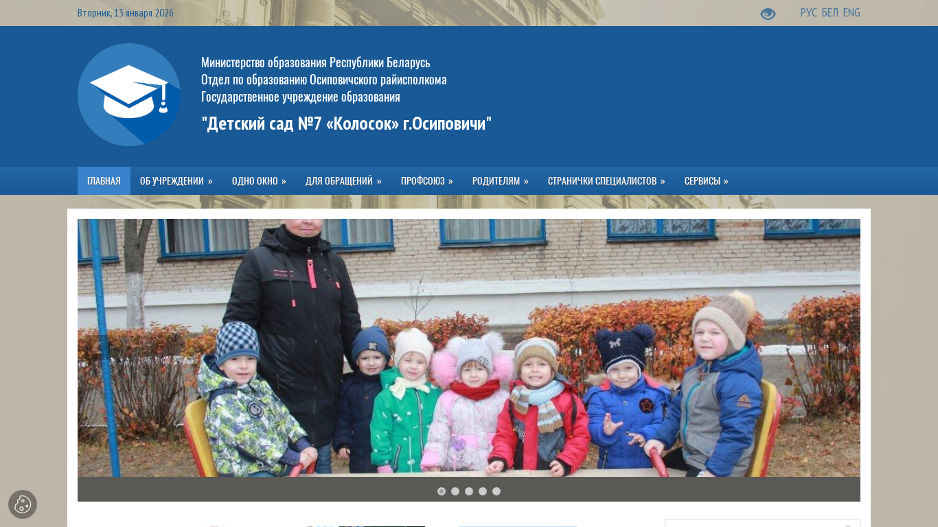 | AI-анализ | Портал "Государственное учреждение образования 'Детский сад №7 «Колосок» г.Осиповичи' (<https://sad7.osipovichiedu.gov.by/>)" предоставляет информацию о детском саду в Осиповичах, Беларусь. Детский сад под названием "Колосок" является государственным образовательным учреждением, и его главная страница была обновлена последний раз 13 января 2026 года. На сайте представлены разделы по управлению учреждения, его структуре, истории и достижениям, а также актуальные новости. Также доступны информация о графике работы, лицензионных данных и контактных деталях. Кроме того, портал предлагает оценку качества предоставляемых услуг, систему контроля посещений и информацию по обработке персональных данных и ответственности педагогических работников. |
