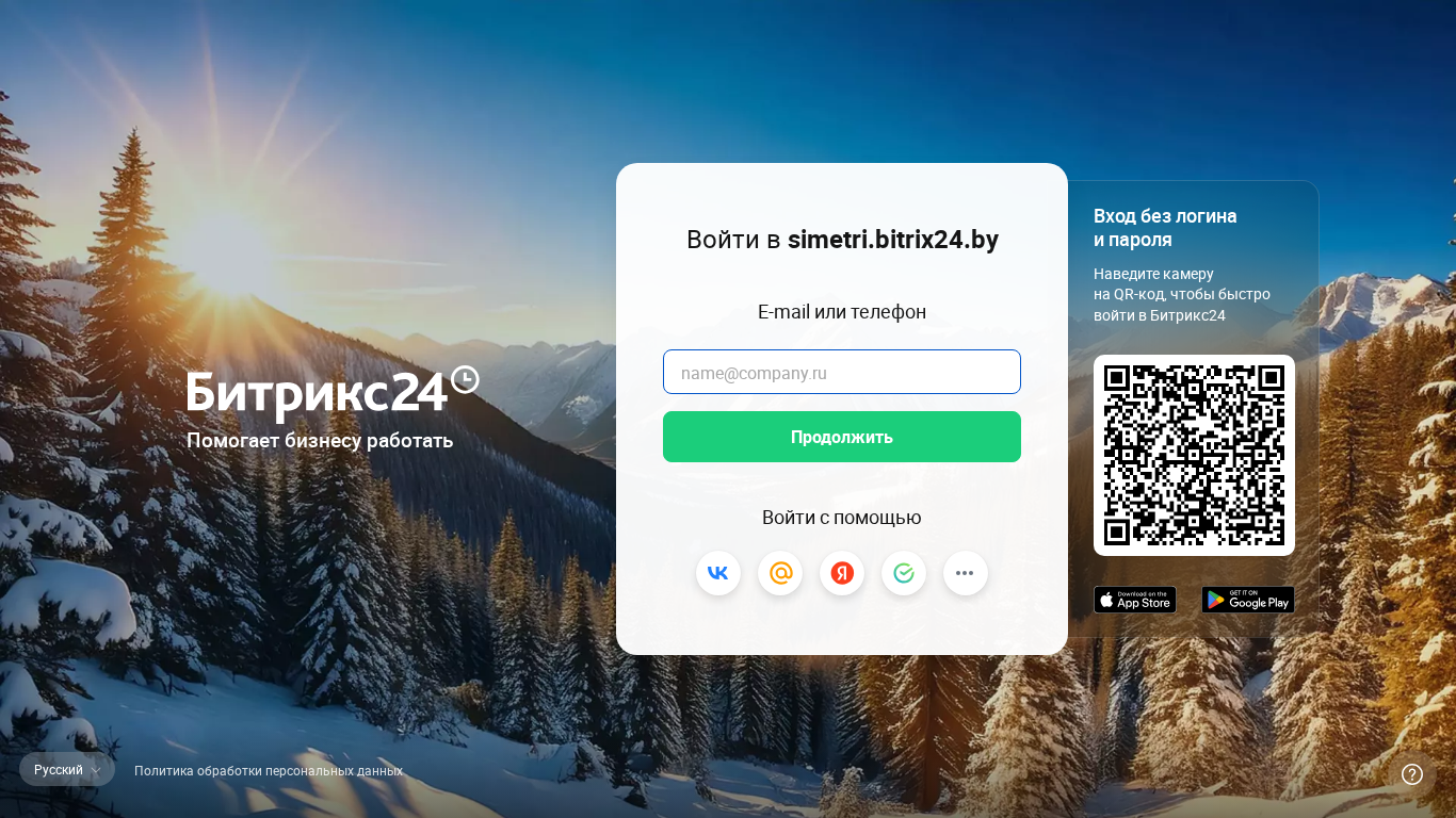 Этот веб-проект, simetri.bitrix24.by, является русскоязычной платформой, предназначенной для улучшения эффективности работы бизнеса. Название сайта "Войти в simetri.bitrix24.by" переводится как "Войти в simetri.bitrix24.by". Пользователи могут войти с помощью электронной почты или номера телефона, или же воспользоваться функцией "Войти без логина и пароля" и сканировать QR-код с камеры для быстрого входа в Bitrix24. Сайт также включает в себя политику конфиденциальности относительно обработки личных данных.