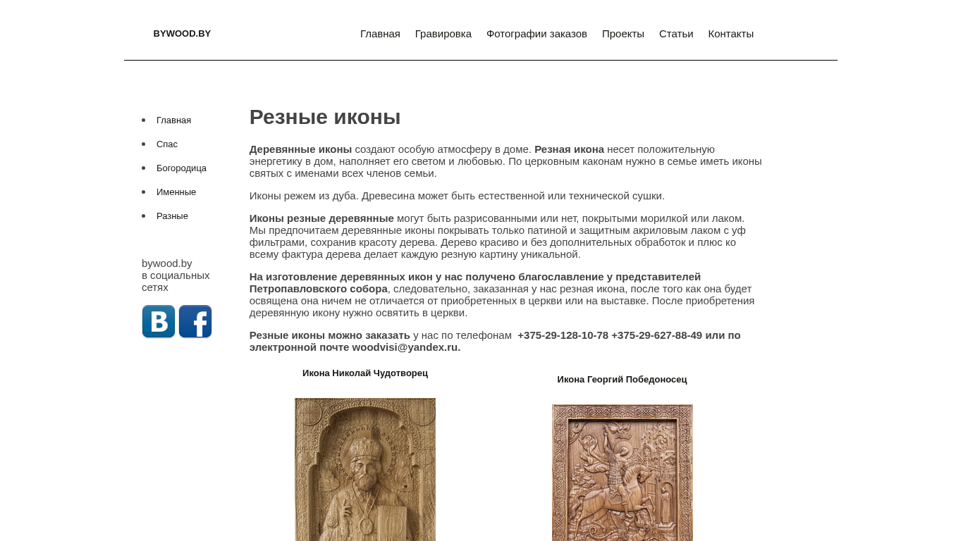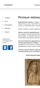 Портал ikona.bywood.by предлагает для продажи резные деревянные иконы. Главная страница сайта представлена разнообразными изображениями Мадонны, Иисуса Христа и других святых. Сайт включает разделы с гравюрами (гравюрами), фотографиями заказов, проектами, статьями и контактами. Описание акцентирует внимание на уникальной атмосфере, создаваемой деревянными иконами, а также на положительной энергии, которую они излучают, подчеркивая важность наличие икон с именами всех членов семьи в доме. Иконы изготовлены из дерева, как натурально высушенного, так и технологически обработанного, и могут быть оставаться без окраса или покрыты лаком или лаковым покрытием. Сайт подчеркивает предпочтение использования только патины и защитного акрилового лака для сохранения естественной красоты дерева и создания уникальности каждого изделия. Производство деревянных икон благословляется представителями Петропавловского собора, что гарантирует высокое качество готовой продукции.