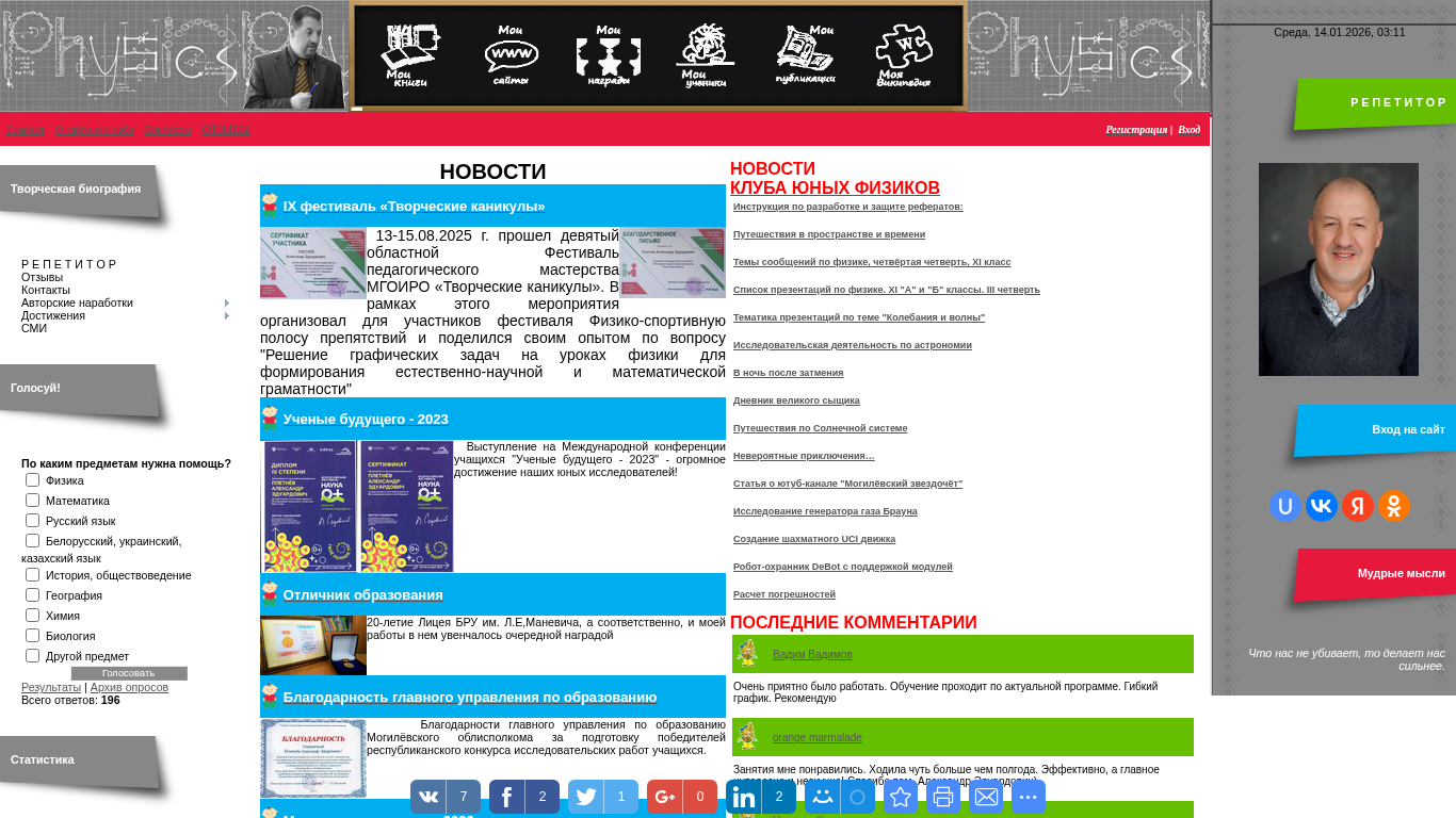 | AI-анализ | Этот онлайн-ресурс представляет собой личный сайт Александра Плетнева, физика-преподавателя, на котором представлены новости, связанные с его образовательной деятельностью и достижениями. Ключевые слова для этого сайта включают 'репетитор по физике', 'портфолио учителя', 'категория учитель-методист', и 'подготовка к сертификации'. Сайт предлагает разделы для обратной связи, контактов, разработок автора, достижений, медиа-проектов и системы обучения автора. Посетители также могут получить доступ к мастер-классам, информации о образовании и профессиональном развитии, выражению благодарности и сертификатам. Сайт содержит новости о различных образовательных мероприятиях, таких как девятый региональный фестиваль педагогического мастерства 'Творческие каникулы', где Плетнев поделился опытом преподавания графических задач по физике. Другие новости включают признание в качестве выдающегося педагога в 2023 году и победу на международных конференциях для студентов. Сайт доступен по адресу... |