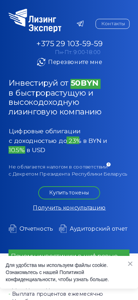 | AI-анализ | The website "This website" is for a Belarusian digital securities marketplace named "Лизинг Эксперт" (Leasing Expert). It offers investors the opportunity to buy digital securities (tokens) with an annual yield of up to 24.5% in BYN (Belarusian rubles). The website provides information about the issuance of these tokens and a hotline number to contact the issuer. Keywords associated with the website include 'tokens', 'BYN', 'premature settlement', 'redemption', 'security', 'issuance', 'yield', 'buy', 'presence', 'planned period', 'volume', 'term', 'capital', and 'financing'. The company, OOO «Блесаварис Лизинг» (Leasing Expert), is a rapidly growing leasing company that finances |