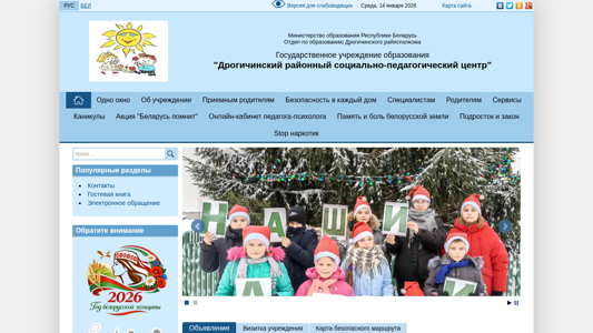 | AI-анализ | The web project "Дрогичинский районный СПЦ" is a website operated by the Drohichyn District Social-Pedagogical Center, an educational institution in Belarus. The site provides information for educators and parents, features news from the center, and introduces the work of pedagogues, social workers, and specialists from the children's social home. The director's contact information, including phone numbers and email address, is available on the site. Regular updates include news from the center, the republic, the region, and the district. The site was last updated on January 14, 2026. |
