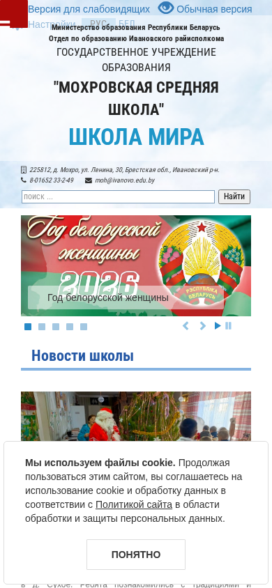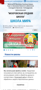 | AI-анализ | This online resource is the official website of Mohrovskaya Srednya Shkola, a middle school located in Mohro, Ivanovo district, Brest Oblast, Belarus. The school's mission and goals, leadership, pedagogical staff, social-pedagogical support, library, extended-day groups, and policies on personal data processing are presented. The website includes information about the school's history, news, and contacts. Visitors can find the school's address, phone number, and email address. The menu includes sections on the school's administration, education, social support, library, and contacts for higher-level organizations. The website also features electronic forms for inquiries and applications, as well as information on disability access and a museum. The school's schedule, admission procedures, and policies on internal order for students are also provided. The website is accessible in Russian and Bel |