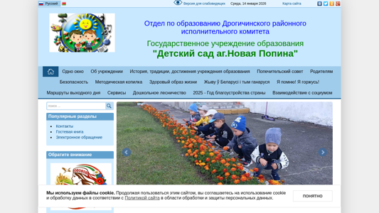| AI-анализ | This online resource is the official website of the "Детский сад д.Новая Попина" (New Popina Kindergarten) in Drogichin, Belarus. The website provides information about the kindergarten, including its history, leadership, educational programs, and safety measures. Keywords associated with the site include "education," "read," "further," "2026," "site," "new," "popina," "institution," "2025," "preschool," "news," "map," and "safety." The site also uses cookies and offers accessibility options for visually impaired users. The main sections of the site include "About the Institution," "Safety," "Methodical Base," "Healthy Lifestyle," and "Contacts." Visitors can also find information about the kindergarten's |