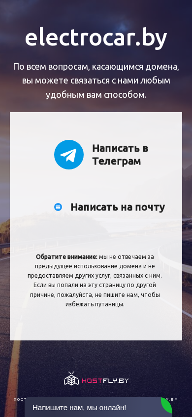 | AI-анализ | This online resource, electrocar.by, is currently for sale. For all inquiries regarding the domain, please contact Hostfly at your convenience via Telegram, email, or by drawing attention to this notice. Please be advised that we do not assume responsibility for any prior usage of the domain and do not offer any related services. Hostfly is the provider for website hosting and domain parking for electrocar.by. |