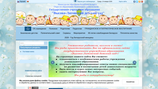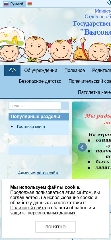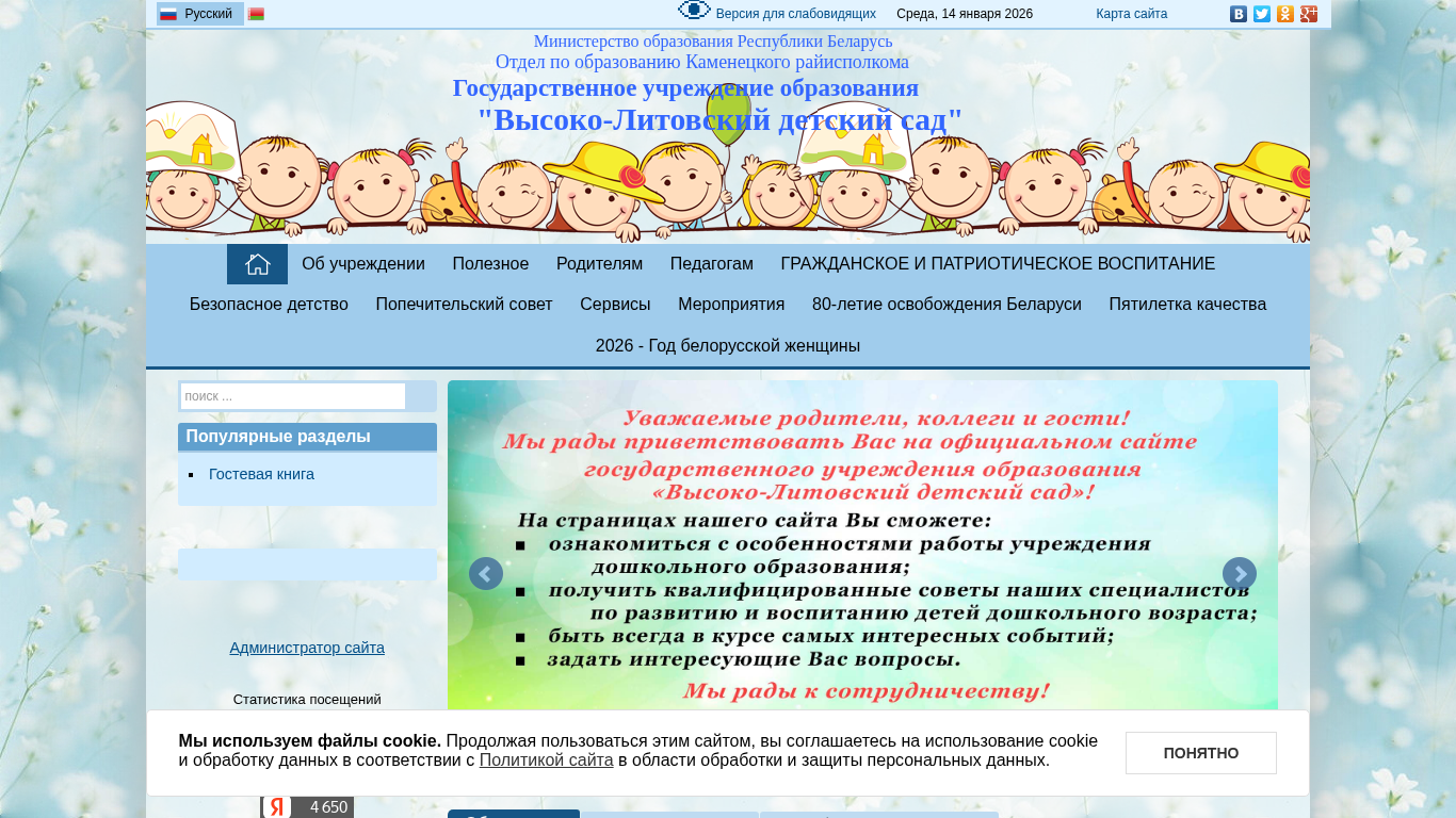 | AI-анализ | This website is for the "Высоко-Литовский детский сад" (High-Lithuanian Children's Garden) in Belarus. The title and description of the website mention that it is a children's daycare institution. The keywords include words related to the institution, such as "education," "news," and "kindergarten." The top words are common phrases found on the website, including "read more" and "further." The website uses cookies and has a Russian language version. The main content of the website includes information about the kindergarten, its services, and various events and news. The kindergarten was recognized as the best in the district for 2023 and received an award from the local government. The website provides contact information, including a phone number and email address. The kindergarten's hours of operation are Monday through Friday, |