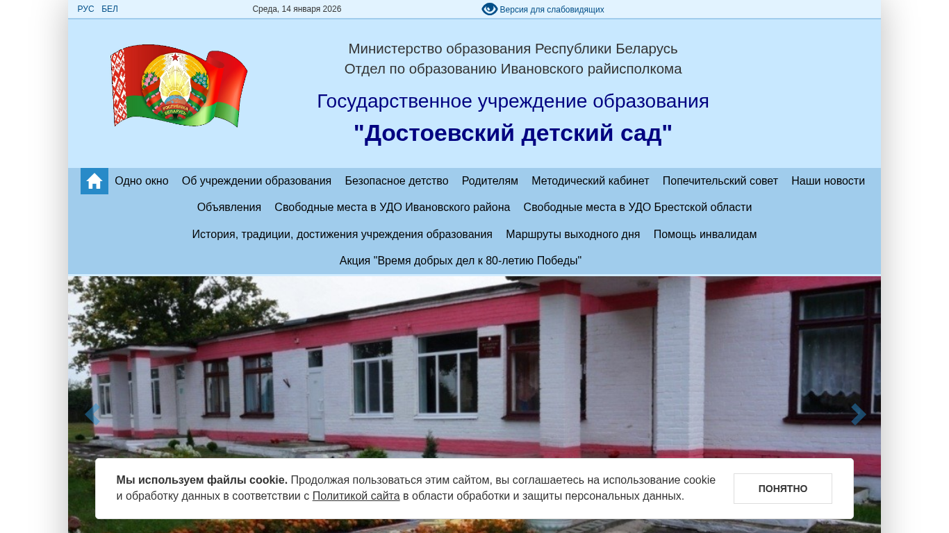 | Адрес | открытия:, 1972, Проектная мощность:, 40 мест, Адрес:, Брестская область, Ивановский район, аг. Достоево, ул. Первомайская, 4 |