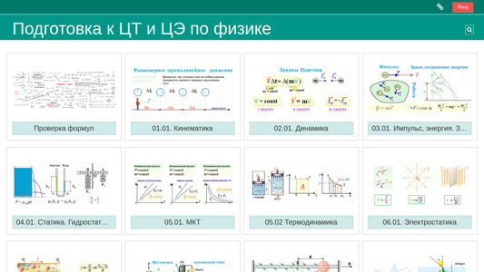 | AI-анализ | This website is dedicated to preparing students for Certifying Tests and Certifying Examinations in the field of physics. The site contains various courses on topics such as kinematics, dynamics, impulse and energy, statics, thermodynamics, electromagnetism, and quantum properties of particles. The main navigation includes sections on "Кинематика," "Динамика," "Импульс. Энергия. Законы сохранения," "Статика. Гидростатика," "МКТ," "Термодинамика," "Электростатика," "Электрический ток," "Магнитное поле," "Колебания и волны," and "Квантовые свойства частиц." Each section likely contains multiple sub-topics and lessons. The site also includes a search function |