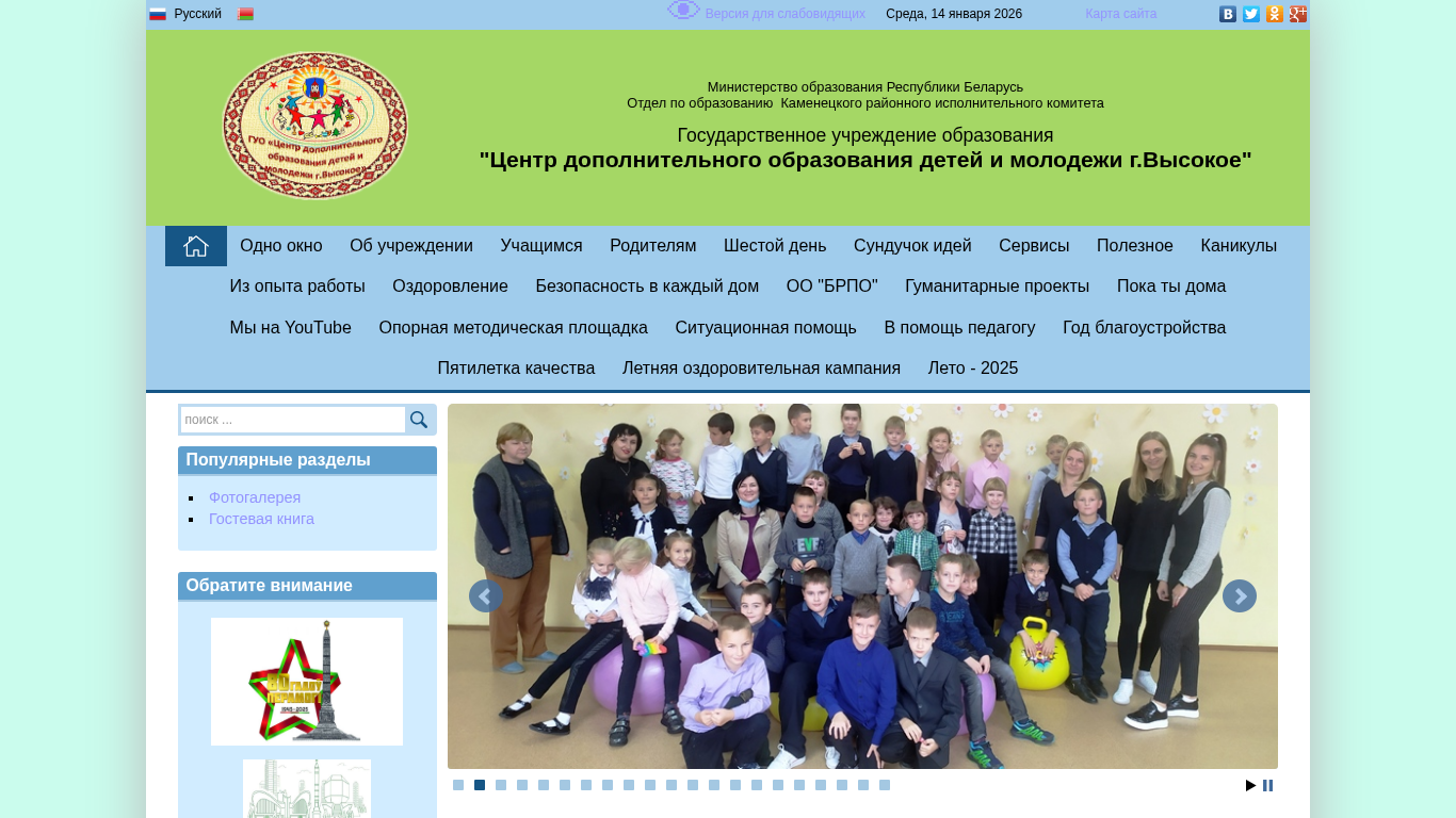 | AI-анализ | --- This website is for the Center for Additional Education for Children and Youth in the city of Высокое, Belarus. The title is "ЦДО детей и молодежи г.Высокое" and the keywords include "education," "children," "youth," and "Высокое." The top words are "January," "read," "further," "education," "news," and "high." The website contains information about the institution, its programs, and services for students and parents. It also includes a contact section with a postal address, phone numbers, and email address. The website is in Russian and offers a variety of educational and support services for children and youth in the region. |