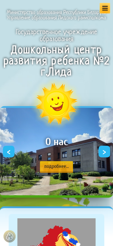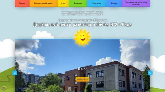 | AI-анализ | The website is for the preschool development center for children number 2 in the city of Lida, Belarus. The main topics of the site include educational process, green schools, inclusive education, documentation for the academic year, teacher accreditation, and support for teachers. The website provides information about the institution's history, traditions, achievements, working hours, management, news, pedagogical staff, union committee, anti-corruption measures, cybercrime prevention, and data protection. Additionally, there is a section for contacts and hours of operation for the institution, as well as information on the administrative procedures and the rights and obligations of citizens during these procedures. The site also includes a rating portal for parents, a question and answer section, a telephone directory, a news section, and information on enrolling children in the preschool, safety measures, the patronage council, and various services. There is also a section |