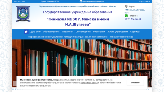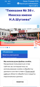 | AI-анализ | This website belongs to the Number 38 High School of Minsk, Belarus. The title of the website is "Гимназия № 38 г. Минска" (Gymnasia No. 38 of Minsk), and the description includes keywords related to the school, its location in Minsk, and the size of its student body. The top words on the website are '2026', 'минска' (Minsk), 'образования' (education), and various phrases such as 'читать далее' (read more), 'района' (district), 'шугаева' (a name), '2025', 'гимназия' (school), 'работы' (jobs), 'учащихся' (students), 'сайта' (website |