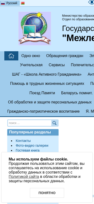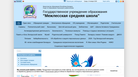 | AI-анализ | This website, titled "Межлесская СШ" (Inter-forest Middle School), is operated by an educational institution in Belarus. The description mentions the use of cookies and a reference to the Ministry of Education in Belarus. The keywords include "школа" (school), "учительская служыбы" (teacher services), "библиотека" (library), and "антикоррупционная деятельность" (anti-corruption activity). The top words consist mainly of numbers, school-related terms, and directives such as "далее" (further), "читать" (read), and "подробнее" (more). The content appears to be in Belarusian, with some sections available in Russian. The website offers various educational services, including a parent university, a help desk, and anti-corruption measures. There |
