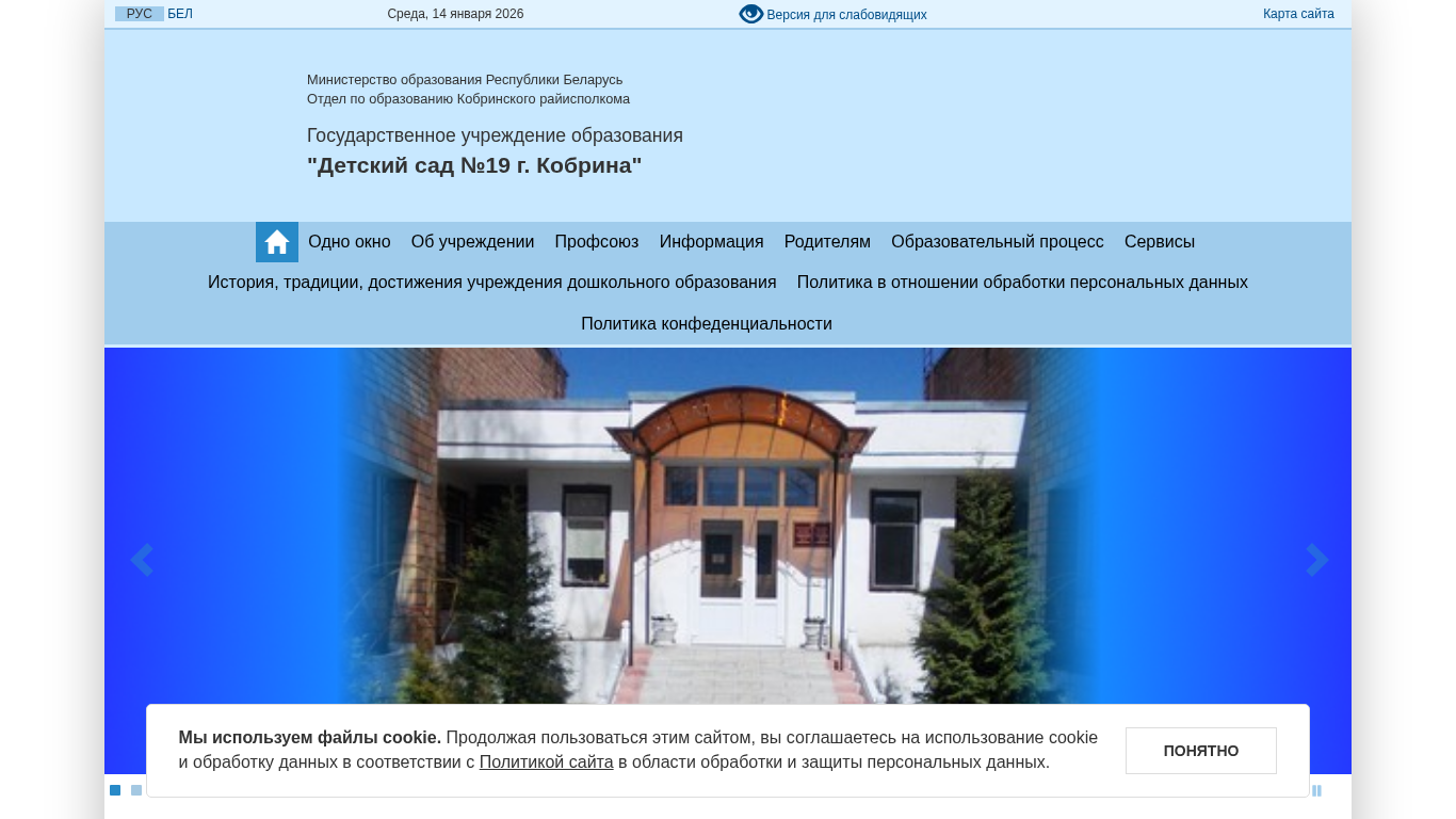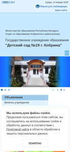 | AI-анализ | This website is for the State Educational Institution "Children's Garden Number 19" located in the city of Kobrin, Belarus. The title and description indicate that it is a kindergarten. The website uses cookies and informs users that by continuing to use the site, they consent to the use of cookies and the processing of personal data according to the site's privacy policy. The site contains information about the kindergarten's schedule, administration, contacts, and various services offered. The top words suggest topics such as data, policy, education, and cookie consent. The site includes sections for the kindergarten's management, pedagogical staff, and photo gallery. Other sections cover topics such as safety, nutrition, parental advice, and various events and celebrations. The site is operated by the Kobrin District Education Department under the Ministry of Education of the Republic of Belarus. |