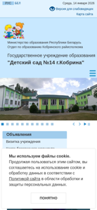 | AI-анализ | The website "Детский сад №14 г.Кобрина" (Children's School No.14 in Cobrin) provides information about the educational institution, its management, and various services. The title and description in Russian suggest it's a kindergarten. Keywords indicate it's a government educational institution in Cobrin, Belarus. The website uses cookies and has a Russian and Belarusian language interface. The top words suggest there's information about the educational process, additional services like a library, and administrative procedures. The website includes a contact section and an electronic form for inquiries. The footer mentions safety, cybersecurity, and various programs for children. The domain is ds14.kobrin.edu.by. |