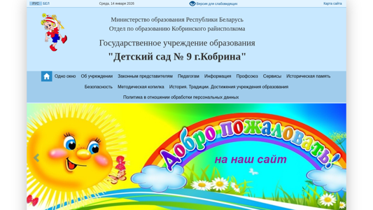 | AI-анализ | The web project "Детский сад №9 г.Кобрина" is a website of a kindergarten located in the city of Kobrin, Belarus. The website provides information about the kindergarten, including its leadership, staff, educational programs, and contact details. Users can find details about the kindergarten's schedule, admission procedures, and various educational services offered. The website also includes a virtual tour, nutritional information, and safety guidelines. The website is administered by the Ministry of Education of the Republic of Belarus and the Kobrin District Executive Committee. It features pages for the kindergarten's principal, music and arts instructors, special needs educators, and physical education instructor. The website also includes information on the kindergarten's goals, mission, and regulatory framework. Additionally, there are sections for parents, including a registration form, a newsletter, |