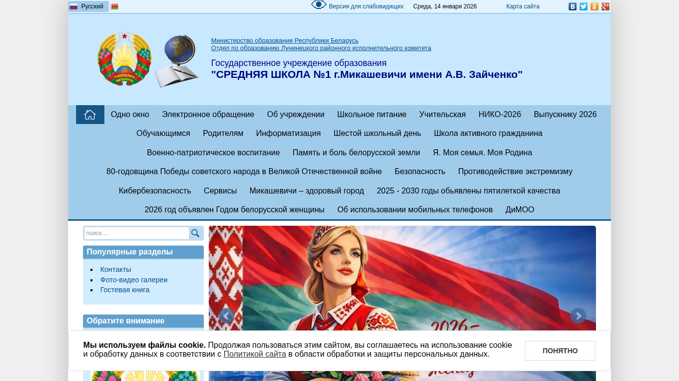 | AI-анализ | The website "СШ №1 г.Микашевичи" (Middle School No.1 in the city of Mikashevichi) is a Belarusian educational institution with a focus on secondary education. The title of the website reflects its name and the location. The description includes information about the use of cookies and a link to the site's policy on data processing. The top words suggest that the site contains news, information about students, and school events, with a particular emphasis on the year 2026. The site offers various services, such as electronic applications, information about school meals, and teacher resources. The site also features a gallery, a guestbook, and popular sections. The domain name indicates that the institution is located in the Luninec region. |