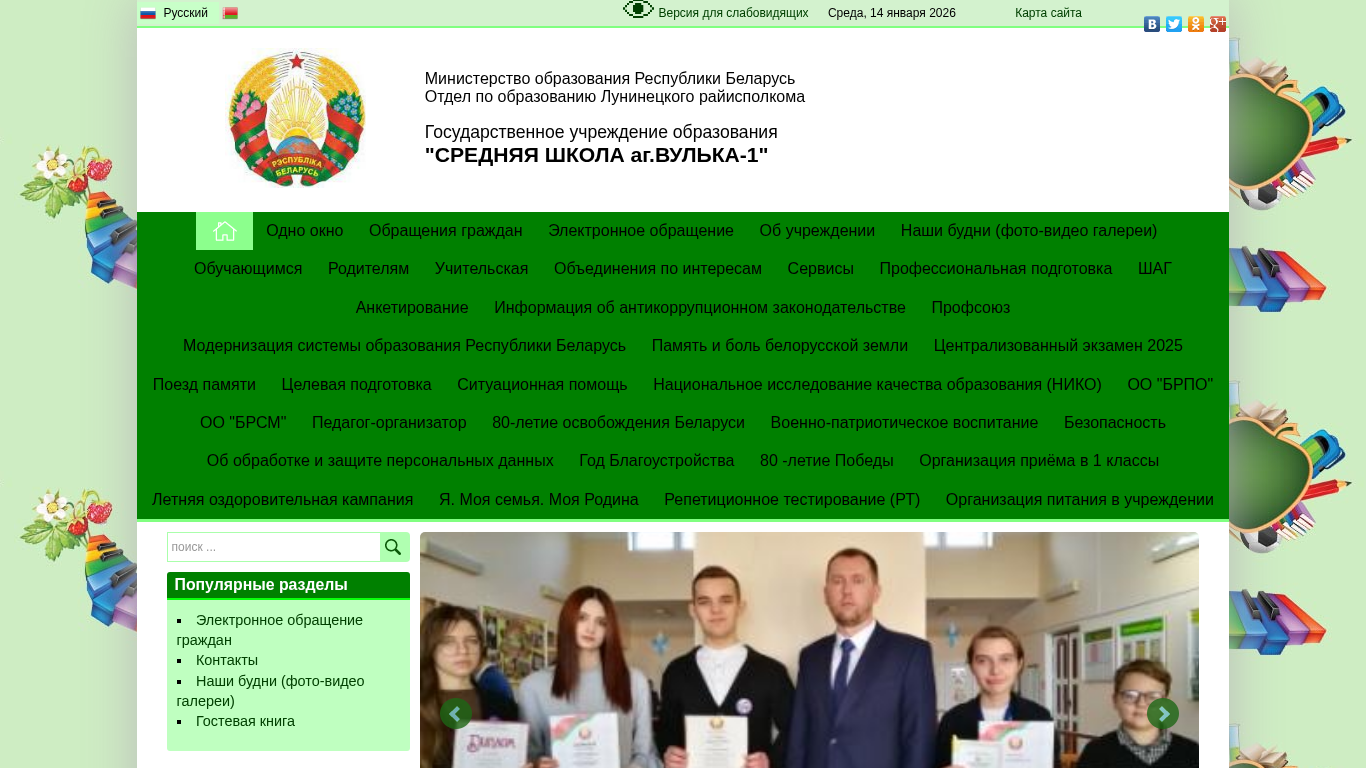 | AI-анализ | The website "СШ д.Вулька-1" (Middle School of the Village Vulka-1) is a Belarusian educational institution's site. The title and description are in Russian. The website contains information about the school, including its name, location, and contact details. Keywords related to education, social matters, and the years 2025 and 2026 are prominent. The site offers various services for students, parents, and teachers, such as professional development, testing, and nutrition services. It also features a gallery, an electronic application system, and information about the educational system's modernization in Belarus. The site is text-heavy with some images, and the color scheme is standard. Accessibility features, such as a text-to-speech option and a high-contrast mode, are available. The site has sections for news, |