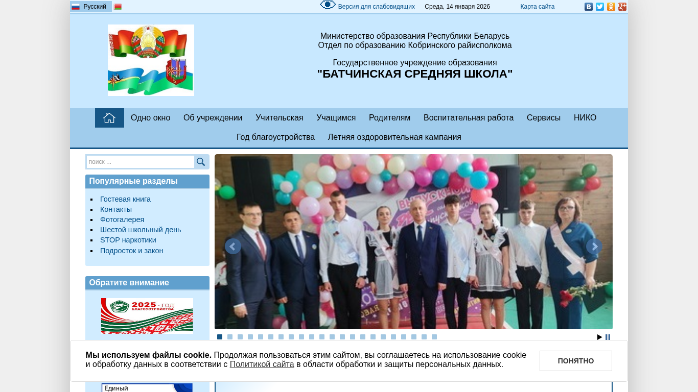 | AI-анализ | The website is for Batchinskaya Srednyaya Shkola (Batchinska Secondary School), located in Kobrin, Belarus. The homepage displays information from the Ministry of Education of the Republic of Belarus and the Kobrin District Executive Committee about the school, its organization, and services for students, teachers, and parents. Popular sections include a news section, a guestbook, and a photo gallery. The school also provides information about its history, educational programs, and extracurricular activities. Additionally, the website features links to various educational resources, announcements, and safety guidelines. The design is standard, with a medium-sized font and a neutral color scheme. Images are disabled by default, with an option to enable them. The website is accessible via a single window and includes a copyright notice and visitor statistics. The top keywords include 'school', 'education', 'we |