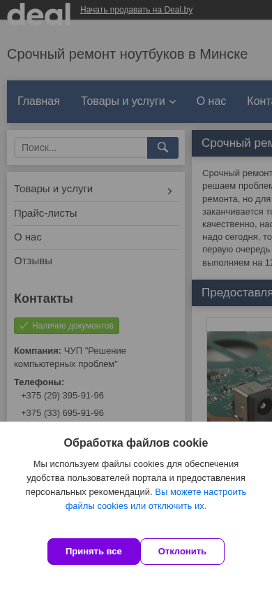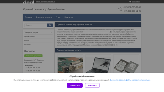 | AI-анализ | The portal "ЧУП "Решение компьютерных проблем"" offers repair services and sales for computers and notebooks in Minsk, Belarus. Contact information includes two phone numbers: +375 (29) 395-91-96 and +375 (33) 695-91-96. The company provides quick repair for various computer issues, including screen damage, power jack replacement, hard drive repair or replacement, and water damage. Pricing is available for each service, with some starting as low as 50 rubles. The business is known for its high-quality work and fast turnaround, even if it means working late to ensure customer satisfaction. Services include SSD upgrades and Windows installation, in addition to the standard repair offerings. |