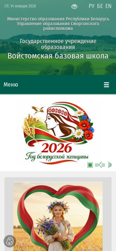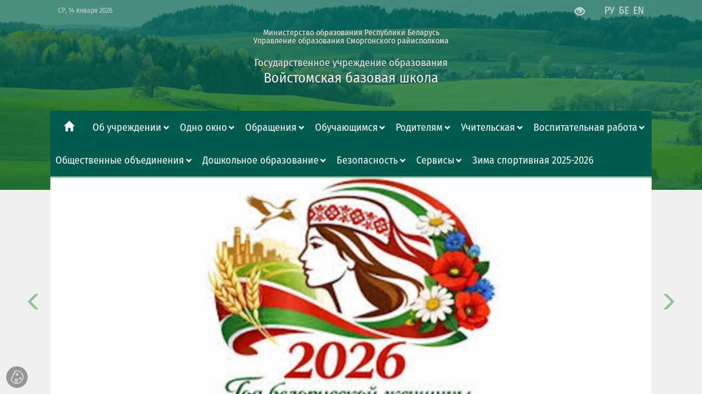 | Адрес | экзамена-2026, подробнее..., © ГУО "Войстомская базовая школа", 2026, Адрес: Сморгонский район, аг.Войстом, ул. Школьная 1 |