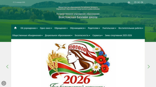 | AI-анализ | The website is for Voistomskaya Bazovaya Shkola (Voistomskaya Base School), an educational institution located in Smorgon, Belarus. The school is part of the Ministry of Education of the Republic of Belarus and is managed by the Sморгонский райисполком (Smorgoń Regional Executive Committee). The site provides information about the school's history, traditions, achievements, and educational programs. Visitors can find details about the school's leadership, teaching staff, and support structures, as well as policies on data protection and contact information. The site also includes sections on innovative practices, student services, and community outreach. The school's schedule, educational materials, and rules for students and parents are also accessible. Additionally, visitors can find information on local resources for psychological, psychiatric, and therapeutic support. The site is available in Russian, |
