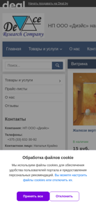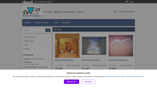 | AI-анализ | --- The web project "НП ООО «Диэйс»" is an online store offering contacts, products, and services from the Belarusian company of the same name. The website provides information on the company's contact details, products including shades, carpets, and curtains, and services. The contact information includes a phone number, address, and map location. The company's products are available both wholesale and retail, with prices listed for vertical and horizontal blinds, and carpets. The website is hosted on the Deal.by platform and uses cookies for user convenience and personalized recommendations. The contact person is listed as Natalia Krainko. |