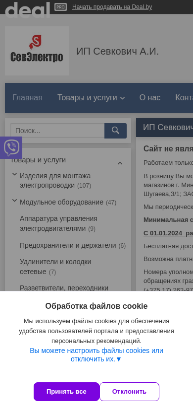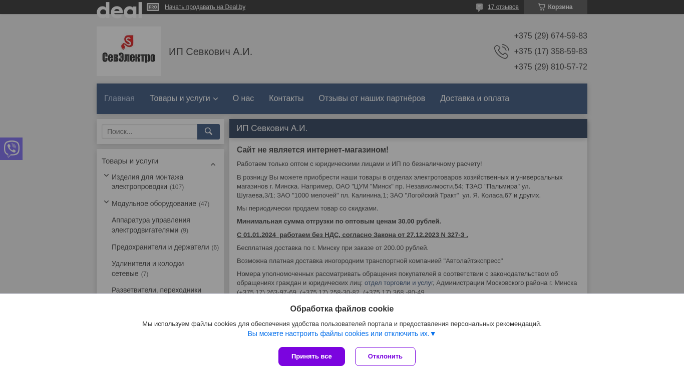 | SEO-описание | "ИП Севкович А.И." - цены на электромонтажные изделия, контакты, оплата, доставка по Беларуси. |