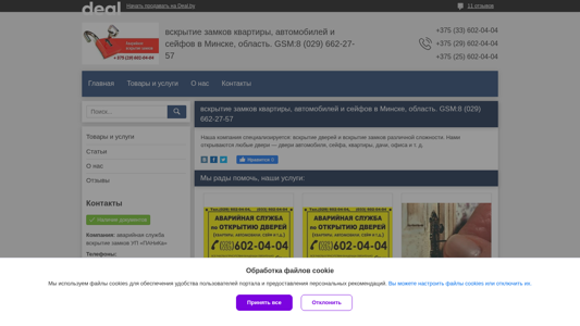 | AI-анализ | This website is a contact and service page for the company "аварийная служба вскрытие замков УП «ПАНиКа»" offering emergency locksmith services in Minsk, Belarus. The company specializes in opening various doors, including car doors, safes, and residential and commercial doors. Prices for services range from 10 to 20 rubles for opening doors and up to 50 rubles for repairing or replacing certain parts. The company provides services in Minsk, as well as in other major Belarusian cities such as Vitsebsk and Homel. Contact information includes phone numbers for MTS, Velcom, and Life mobile network providers. |