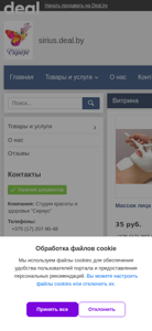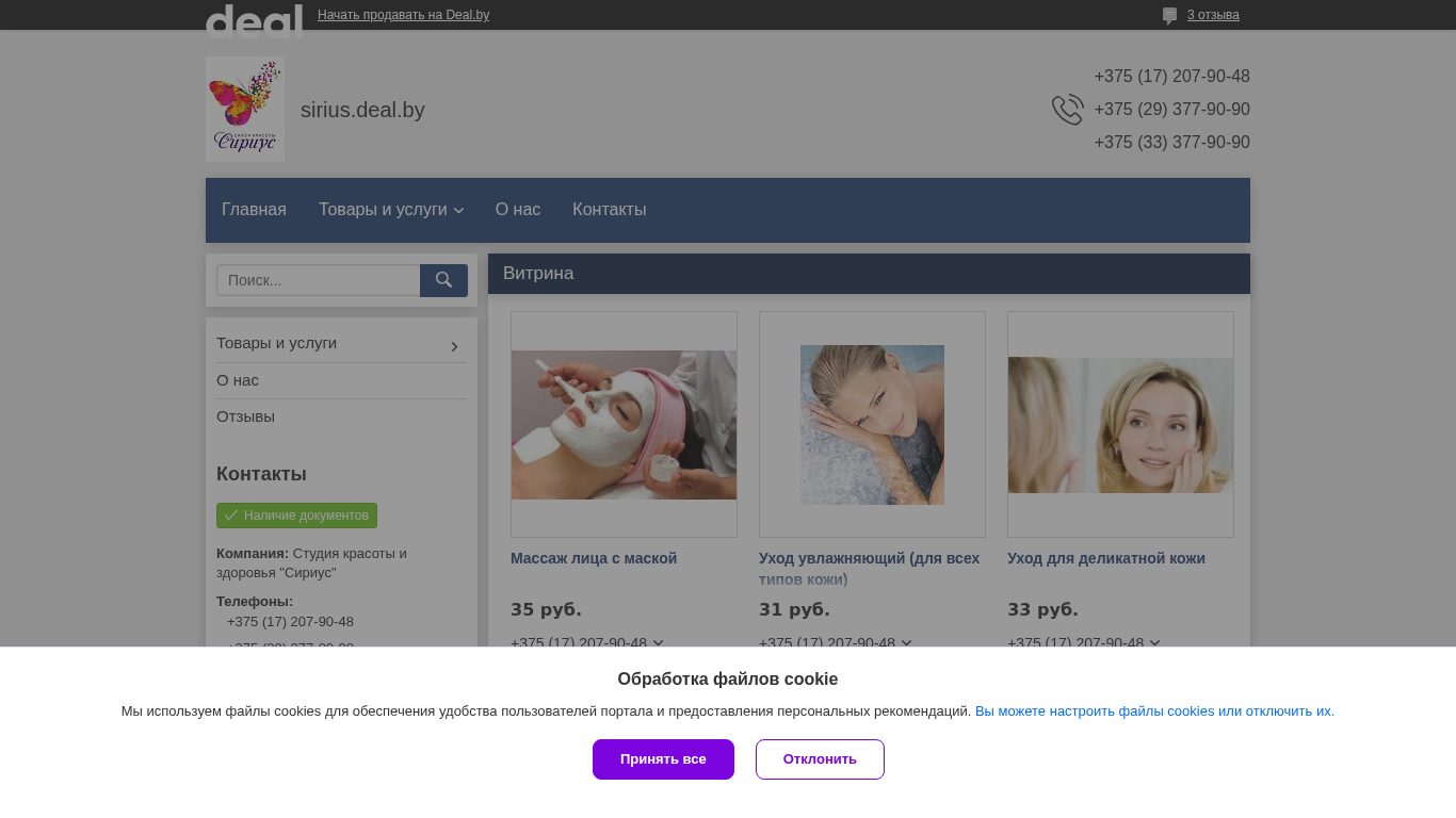 | AI-анализ | The web project "Студия красоты и здоровья Сириус" is a Belarusian business offering contacts, products, and services related to beauty and health. The website is hosted on the Deal.by platform and utilizes cookies for user convenience and personalized recommendations. The company's contact information includes phone numbers +375 (17) 207-90-48, +375 (29) 377-90-90, and +375 (33) 377-90-90. The main products and services provided are in the field of cosmetology. Some of the offerings include a face massage with a mask for 35 rubles, a hydrating facial treatment for 31 rubles, a facial treatment for delicate skin for 33 rubles, and modeling |