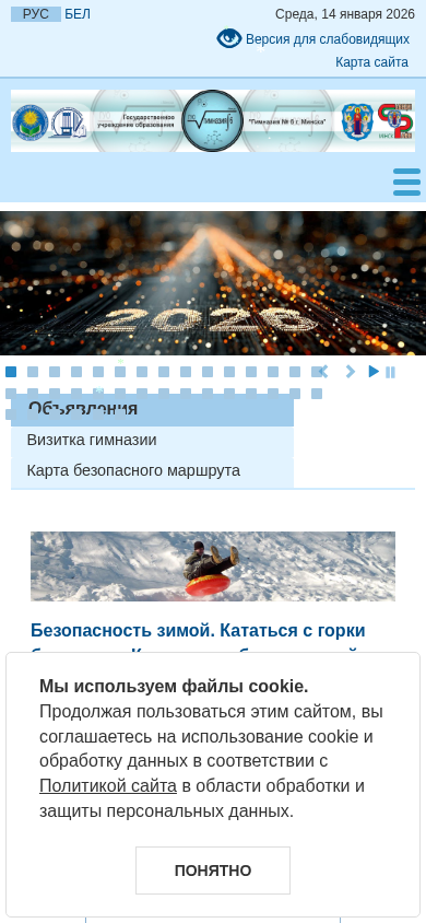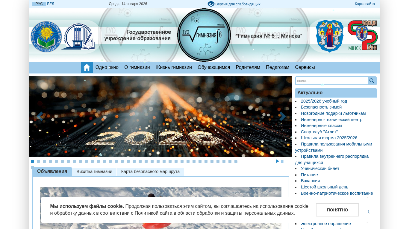 | AI-анализ | The portal gymn6.minsk.edu.by is the official website of Gimnaziya No. 6 g. Minsk, a state educational institution located in Minsk, Belarus. The site provides information about the school's administration hours, admission procedures, and various administrative processes. Popular topics include electronic applications, requirements for applications, and forms. The site also features information about vacancies, anti-corruption measures, and the school's policy on confidentiality. Additionally, there are sections dedicated to the history of the school, its infrastructure, and various educational programs, including engineering classes and sports clubs. The site uses cookies and can be customized with font size, text spacing, and color scheme options. It also includes a map of the site and an RSS feed. |