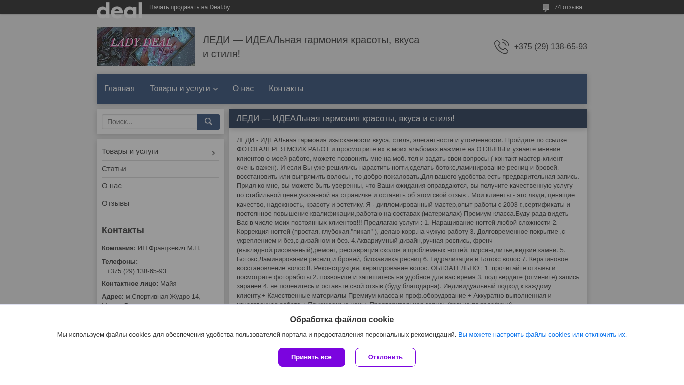 | AI-анализ | The website "Lady.deal.by" is an e-commerce platform for the beauty services provided by IP Franckevich M.N., offering contacts, products, and services, including nail enhancements, correction, design, and ucrepation (upkeep) of nails, as well as hair restoration and straightening. The website features customer reviews and a photo gallery of the master's work. The contact information includes a phone number for clients to ask questions or make appointments. The master, who has been in business since 2003, is a certified professional with a diploma and ongoing training. Services offered include various types of nail enhancements, such as acrylic and gel, as well as botox and laser treatments for hair. The website is available on Deal.by and has received 74 positive reviews. |