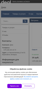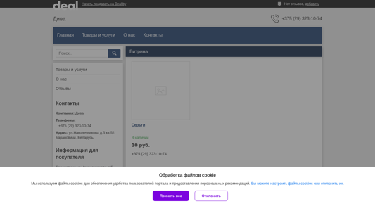 | AI-анализ | This online resource, titled "Дива" (Diva), is a Belarusian .BY domain that provides contact information, goods, and services, along with their corresponding prices. The website is hosted on the Deal.by platform and uses cookies to enhance user experience and deliver personalized recommendations. The company's contact details include an address on ul. Наконечникова d.5 кв.52, in Baranovichi, Belarus, and a telephone number +375 (29) 323-10-74. There are no customer reviews mentioned on the site. The main product categories include an assortment of goods and services, with a focus on jewelry, as evidenced by the "Витрина Серьги" (Jewelry Display) section. |