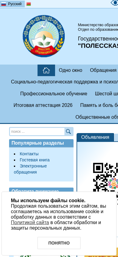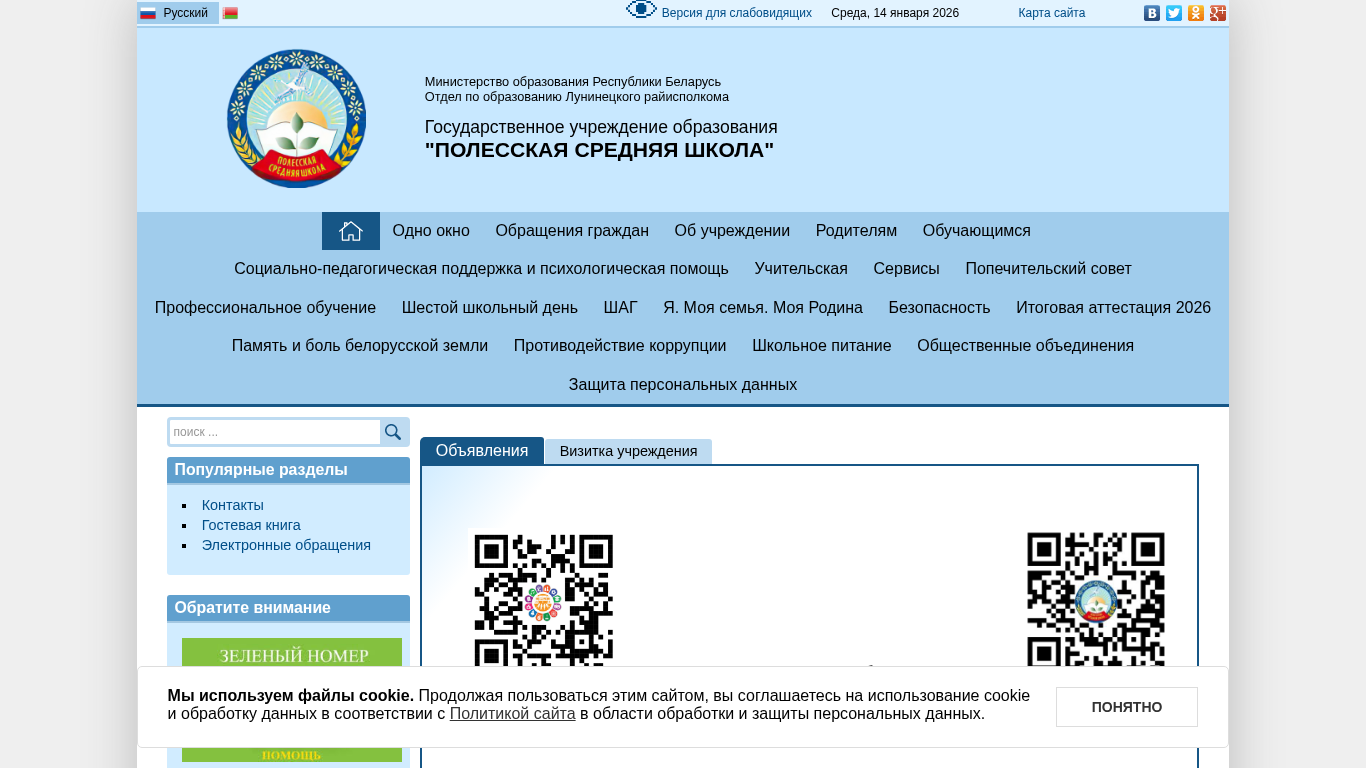 | AI-анализ | The website "Полесская СШ" (Poleskaia SS) is a Belarusian educational institution's site, as evidenced by the title and numerous keywords related to education and schools. The site contains news, announcements, and information for parents and students. The top_words suggest that the site includes sections for one-window services, social-pedagogical support, and teacher services. The site uses cookies and has a Russian language version. The site's content includes information about the institution's location, contact details, and a calendar of events. The site also features a section for popular topics and a contact form for electronic inquiries. The site's domain is poleski.luninec.edu.by. |