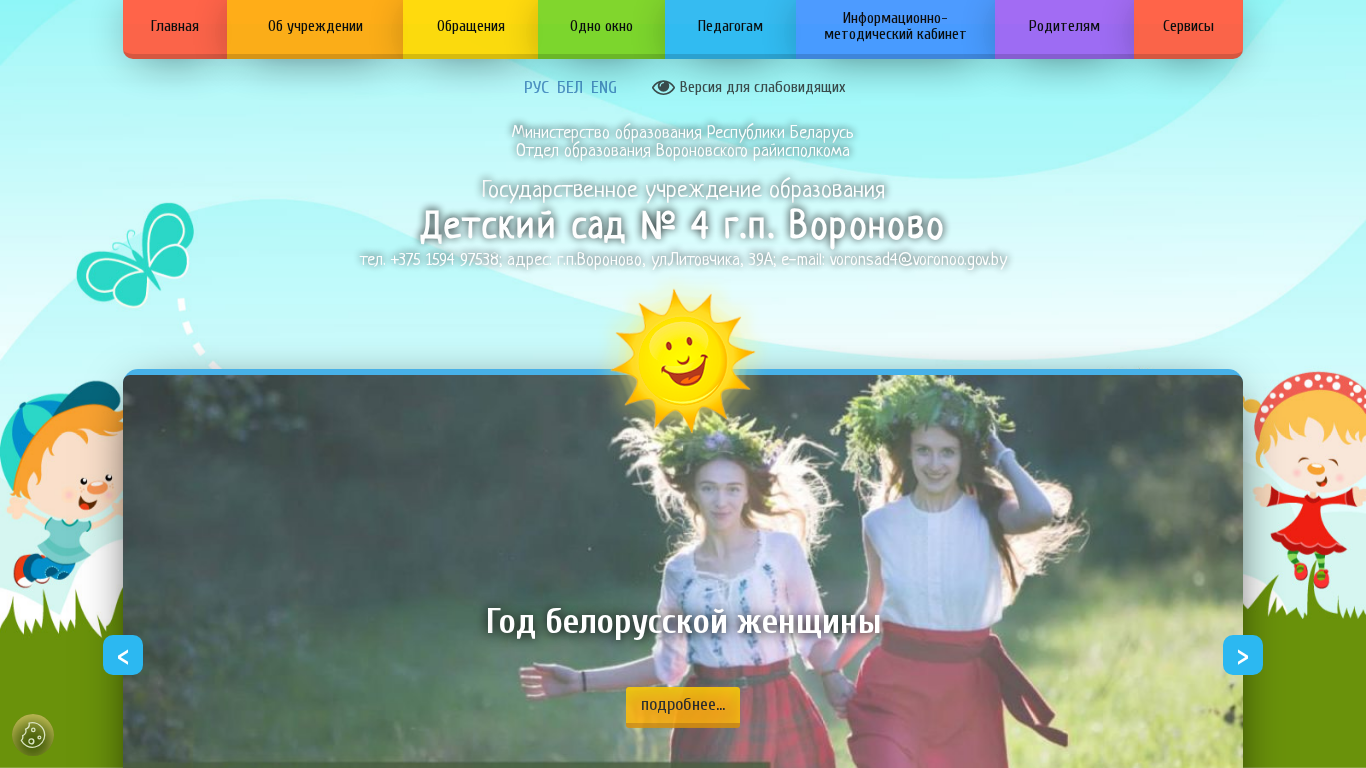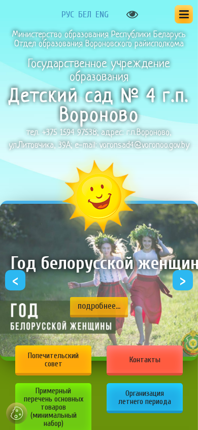 | Адрес | Государственное учреждение образования, Детский сад № 4 г.п. Вороново, тел. +375 1594 97538; адрес: г.п.Вороново, ул. Литовчика, 39А |