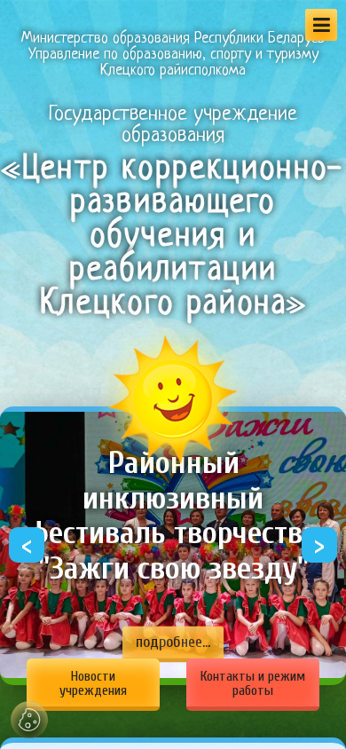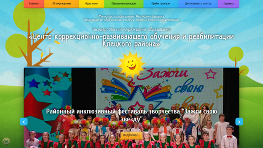| AI-анализ | The web project is a regional educational institution named "Centre for Correctional-Developmental Education and Rehabilitation of Kletsk District." It is the homepage of the institution, providing information about its history, mission, administration, contacts, and operating hours. The institution's main focus is on education and rehabilitation for individuals with various needs. It offers a range of services including social-psychological assistance, a parent support council, and an anti-corruption commission. The website also features news, interactive maps, and information on structural organization, methodological work, and administrative procedures. Additionally, it provides resources for Minregion and educational institutions, as well as services for students, parents, and the community. The institution is committed to creating an inclusive society and offers a theater presentation, a regional inclusive festival, and the "Light Your Star" campaign for children from 0 to 3 years old. The |